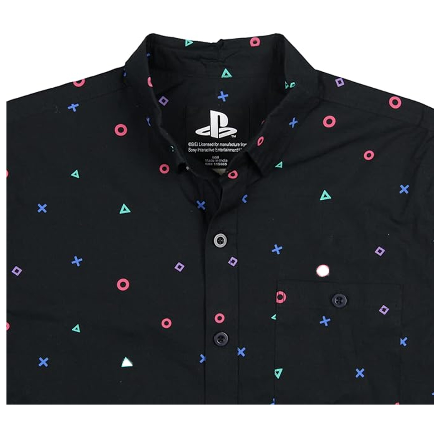Esta camisa negra tejida con botones cuenta con un diseño estampado de iconos de control de juegos.