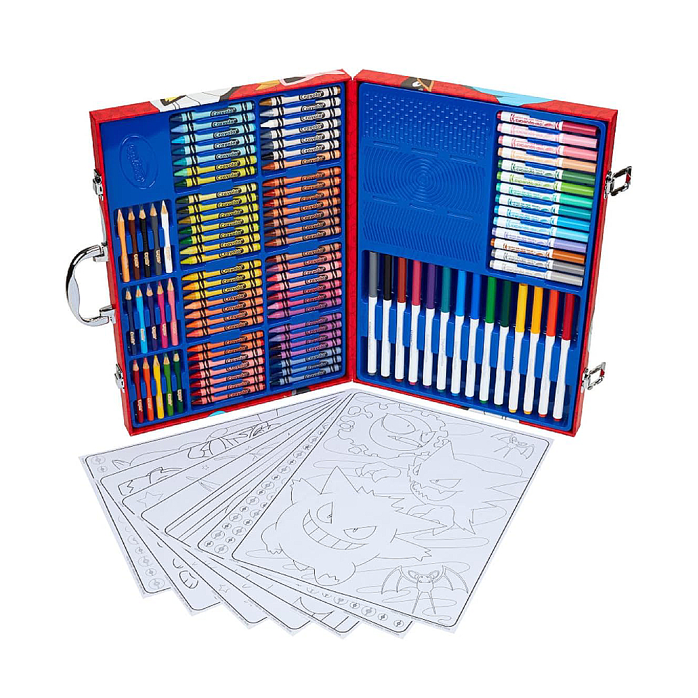 - Este estuche de arte con temática de Pokémon cuenta con 115 piezas de arte, incluyendo: 56 lápices de colores, 15 lápices de colores cortos, 28 marcadores lavables y 15 páginas para colorear.