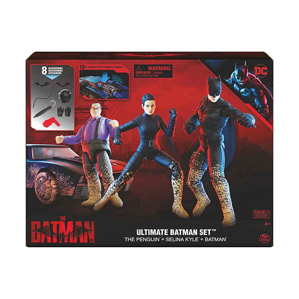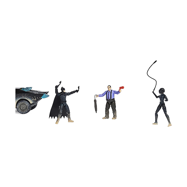 - 3 figuras exclusivas de Batman: incluye figuras de acción de Batman, Selina Kyle y The Penguin de 4 pulgadas con escultura detallada y estilo de película auténtica. Con 11 puntos de articulación, es fácil colocar las figuras de acción