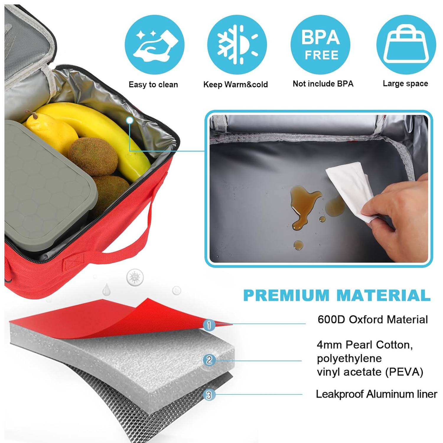 La lonchera está hecha de 3 capas de material de primera calidad. El exterior está hecho de tela Oxford resistente al agua y a las manchas, que es reutilizable, duradera y fácil de limpiar. La capa intermedia utiliza esponja aislante de 0.315 pulgadas, los diversos compartimentos combinados con el diseño aislado mantendrán los alimentos y bebidas de tu hijo a la temperatura perfecta, el interior aislado ayuda a mantener la temperatura deseada de sus comidas, ya sea una sopa tibia o una ensalada refrescante. Con su espacioso compartimento principal, hay mucho espacio para empacar sus aperitivos, sándwiches, frutas y bebidas favoritas.