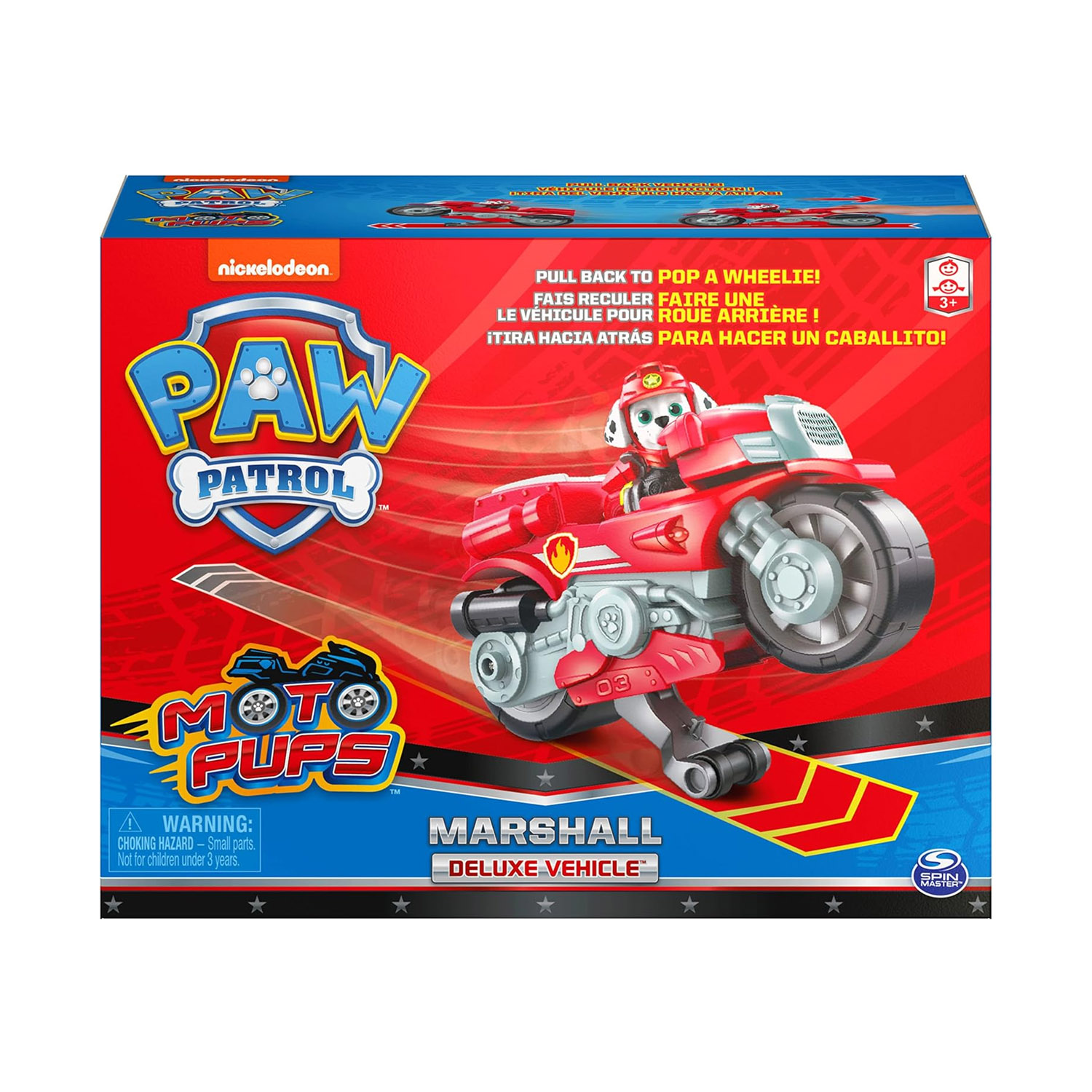 ¡Velocidad al rescate con Marshall de Paw Patrol y su vehículo Deluxe Moto Pups! La motocicleta única de Marshall cuenta con gráficos y detalles auténticos, ruedas grandes y una función de retroceso que le permite realizar piruetas. Equipado con su chaqueta y casco de motocicleta, ¡Marshall (figura incluida) está listo para una emocionante acción de Moto Pups! Cuando llegue el momento de una misión de alta velocidad, coloca a Marshall en el asiento del conductor, tira del vehículo hacia atrás y ve cómo avanza. La motocicleta de Marshall se lanza hacia adelante, y hace una pirueta, ¡avanza directamente hacia la aventura! Presiona el vehículo hacia atrás para crear tus propias acrobacias y hacer piruetas, una y otra vez, ¡es muy divertido! También puedes empujar el vehículo Deluxe de Marshall para jugar a mano. Los vehículos Moto Pups Deluxe traen a la vida las motocicletas del exitoso programa de Paw Patrol. Colecciónalos todos (cada uno se vende por separado) y usa tu imaginación para salvar el día. Para aún más acción con Moto Pups, utiliza los vehículos Deluxe con el juego Moto HQ (se vende por separado) y lanza y da piruetas para el rescate. ¡Acompaña a Marshall en misiones llenas de acción con su vehículo Moto Pups Deluxe!