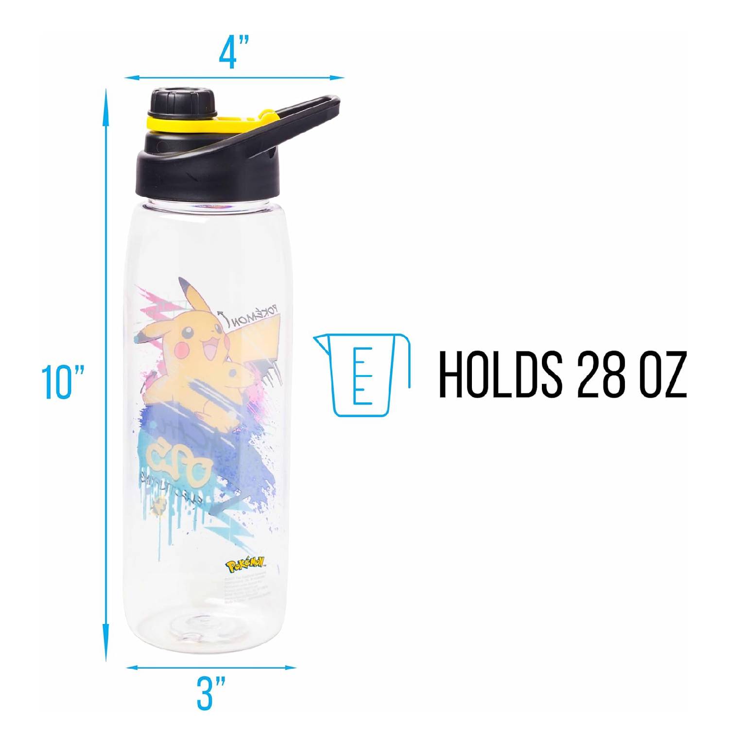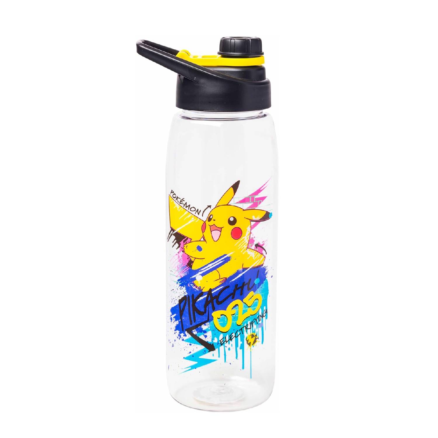 - Pokemon Pikachu: botella de agua de diseño único cuenta con el famoso Pikachu amarillo de Pokemon en una impresión gráfica de pintura en aerosol.