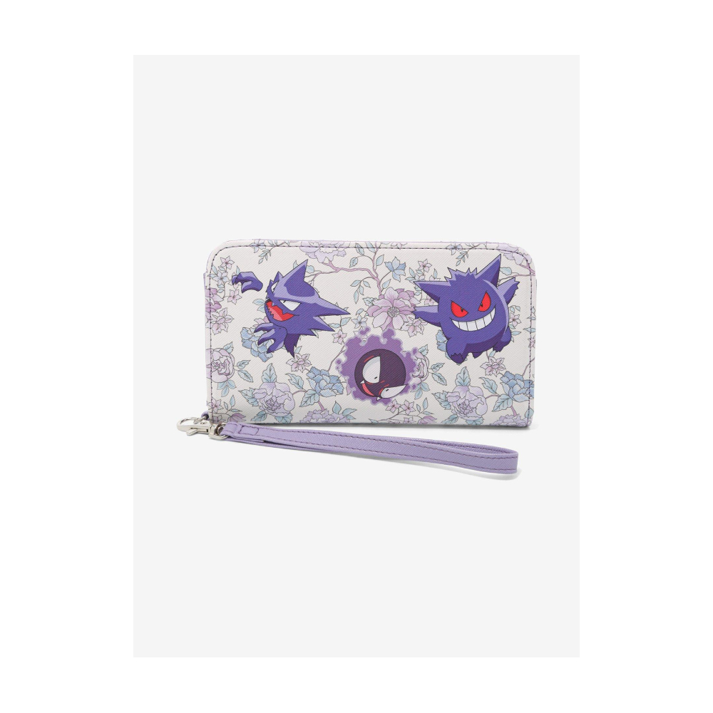 Esta cartera tecnológica con un diseño llamativo de rosas moradas, Gastly, Haunter y Gengar es perfecta para guardar tus objetos esenciales.