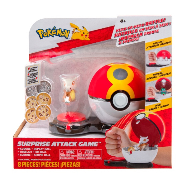Pokebola Ataque Sorpresa Poke Ball viene con la figura de Cubone de ataque sorpresa y 6 discos de ataque. Lo mejor de todo es que puedes jugar sin límites en fantásticas batallas creadas por ti, solo elige un disco de ataque, se cargan en la Poke Ball de ataque sorpresa y golpea el botón para girar la Poke Ball y sorpréndete revelar todo el potencial de tu Pokémon. ¿Estás listo para el próximo desafío?