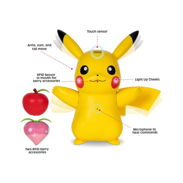 - VOZ Y BAYAS: Pikachu reacciona a accesorios únicos de bayas, así como a la voz y al tacto.