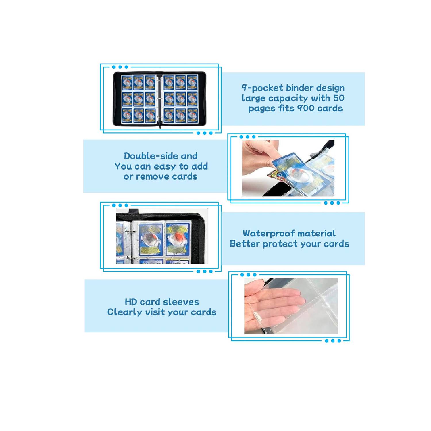 - El álbum de carpetas de tarjetas está hecho de espuma EVA impermeable y cuero PU, con buena resistencia a golpes, polvo y humedad.