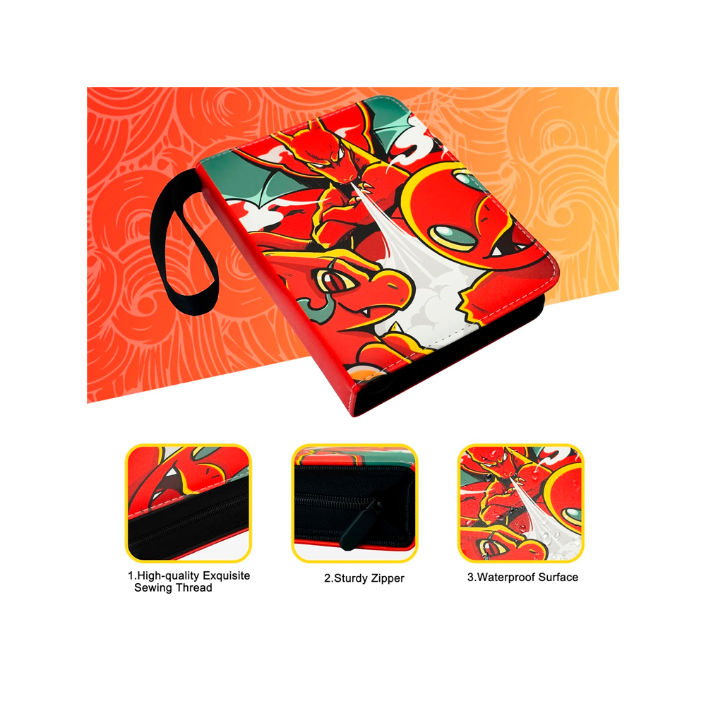 Este portafolio premium te ofrece materiales resistentes al agua y polvo, un diseño único con temática de Charmander, Charmeleon y Charizard, y una gran capacidad para mantener tus cartas seguras y ordenadas.