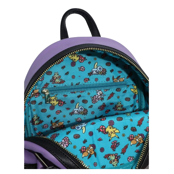¡Atrapa Pokémon con estilo floral con esta mochila mini de Loungefly! Con una aplicación de Gengar en el bolsillo delantero, el frente de esta bolsa incluye detalles en relieve de Pikachu, Eevee y flores. Con retratos de Charizard y Scorbunny en los bolsillos laterales y retratos de Grookey y Sobble en la parte trasera, esta bolsa es perfecta para llevar a tu próxima sesión de entrenamiento.