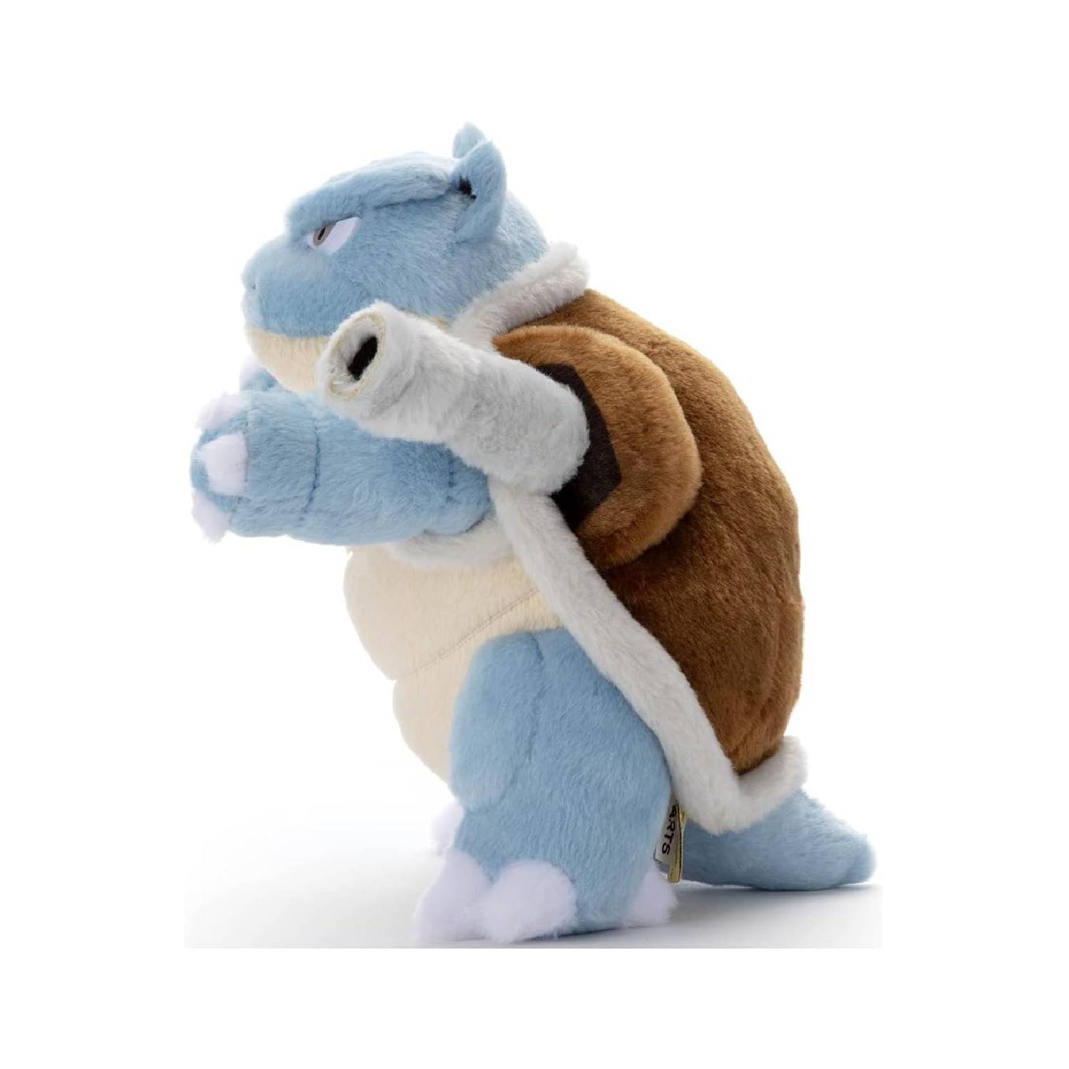 - El peluche reproduce fielmente los detalles de Blastoise, incluyendo sus cañones de agua y su caparazón, con costuras y bordados precisos.