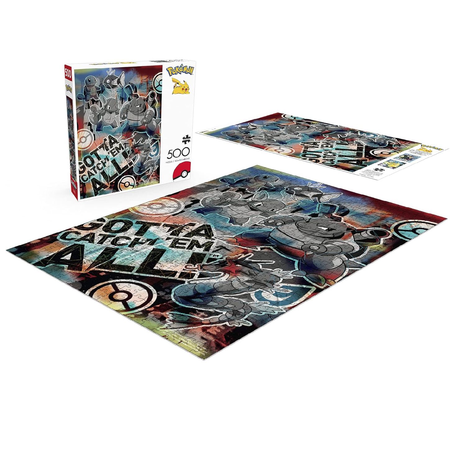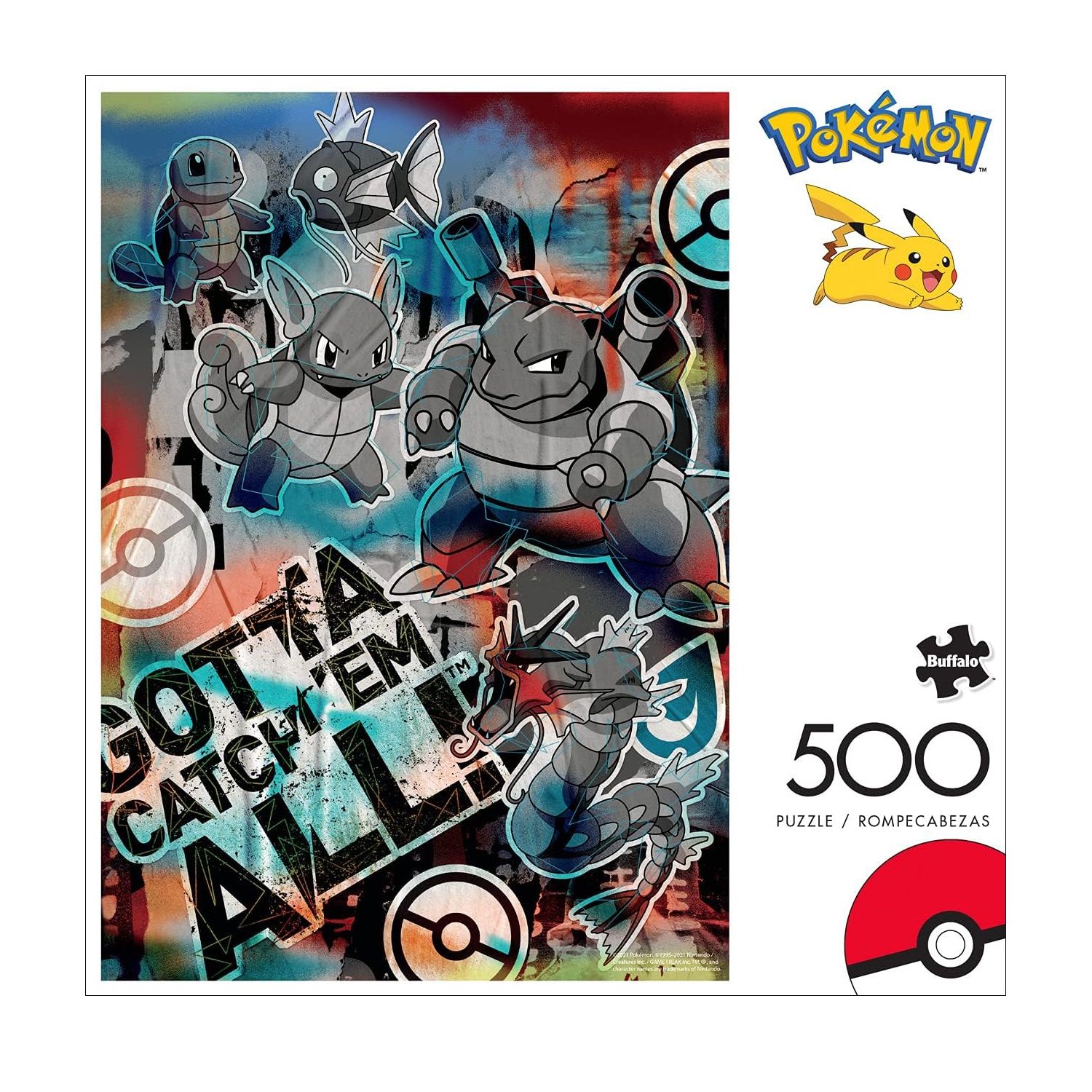 - Este rompecabezas de Pokémon de 500 piezas cuenta con las Evoluciones de Squirtle y Magikarp. Reúne a Squirtle, Wartortle, Blastoise, Magikarp y Gyarados frente a un fondo colorido y las palabras «Gotta Catch ‘Em All!»™.