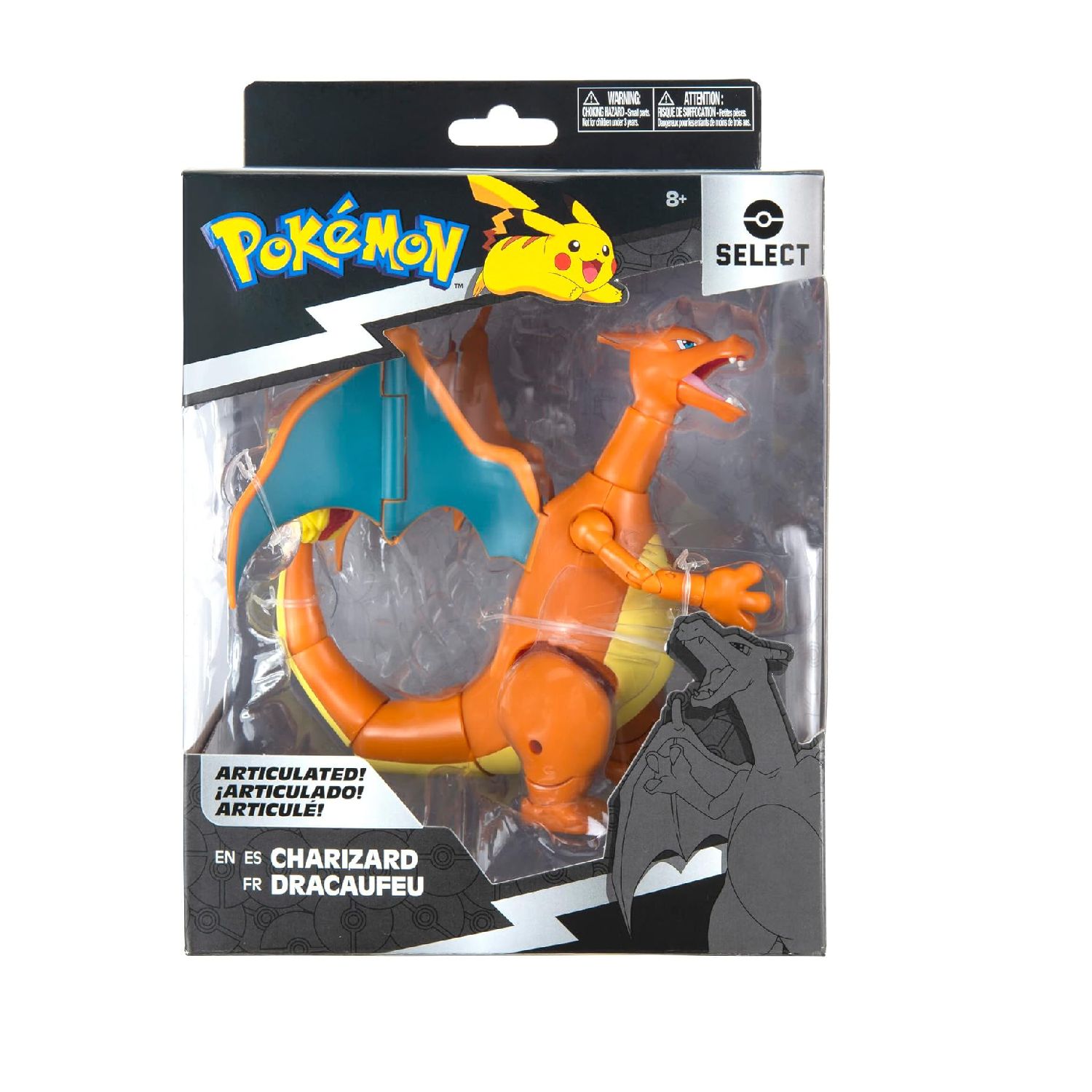 Elige a Charizard, el Pokémon de fuego. Esta figura de 15 cm sumamente detallada presenta más de 15 puntos de articulación. También incluye un accesorio especial para posar en el brazo, por lo que se puede exhibir de varias maneras. ¡Esta figura de 15 cm con súper articulación viene en un empaque Select negro y plateado y parece que salió volando de la serie animada Pokémon! ¡Producto Pokémon con licencia oficial de Jazwares!