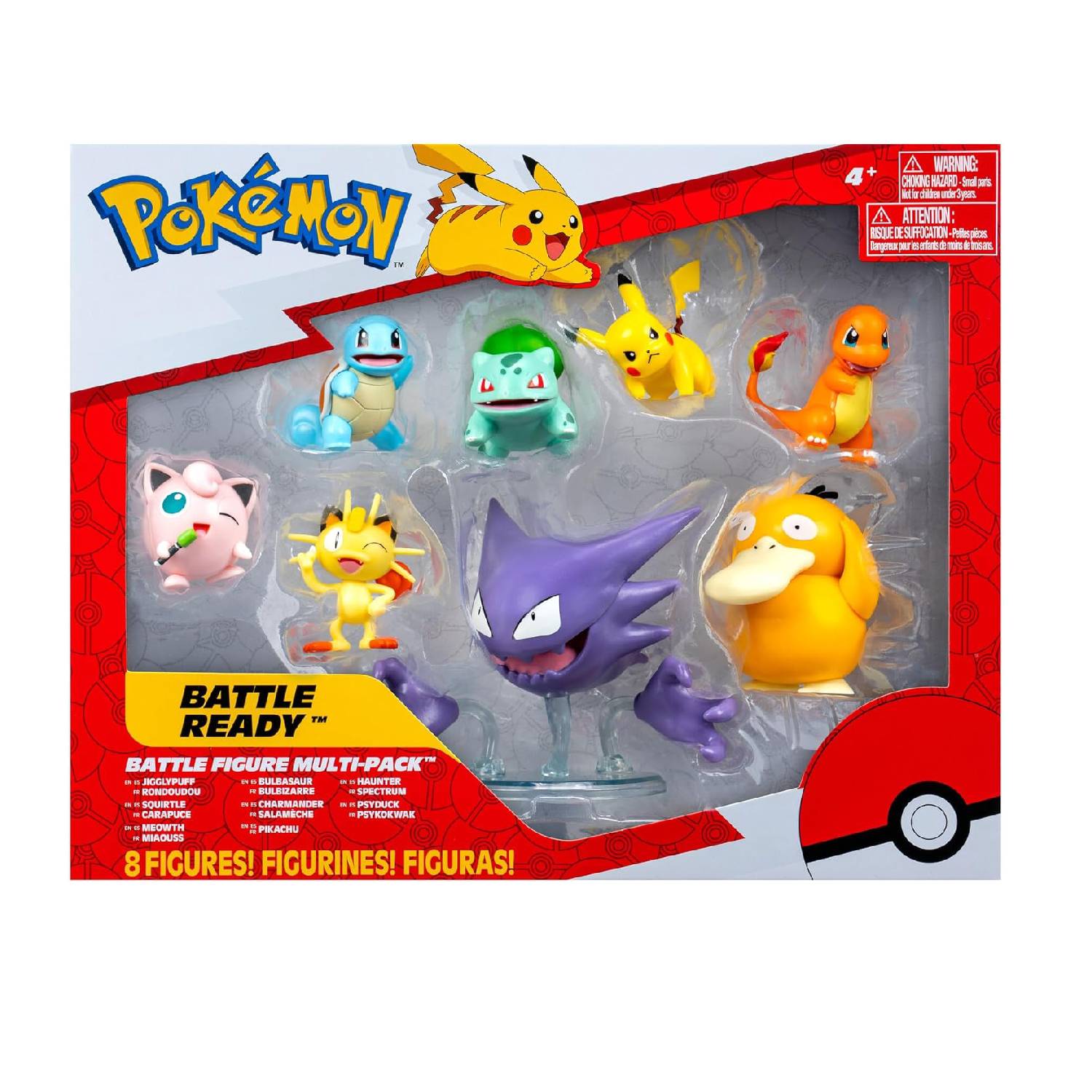 Incluye Pikachu de 2 pulgadas, Bulbasaur, Squirtle, Charmander, Jigglypuff y Meowth más Haunter y Psyduck de 3 pulgadas. Todos ellos cuentan con detalles auténticos y parecen haber salido de la serie animada de Pokémon. Equipado con múltiples tipos de Pokémon, estarás listo para luchar contra cualquier entrenador en cualquier reino. Producto Pokémon con licencia oficial de Jazwares.