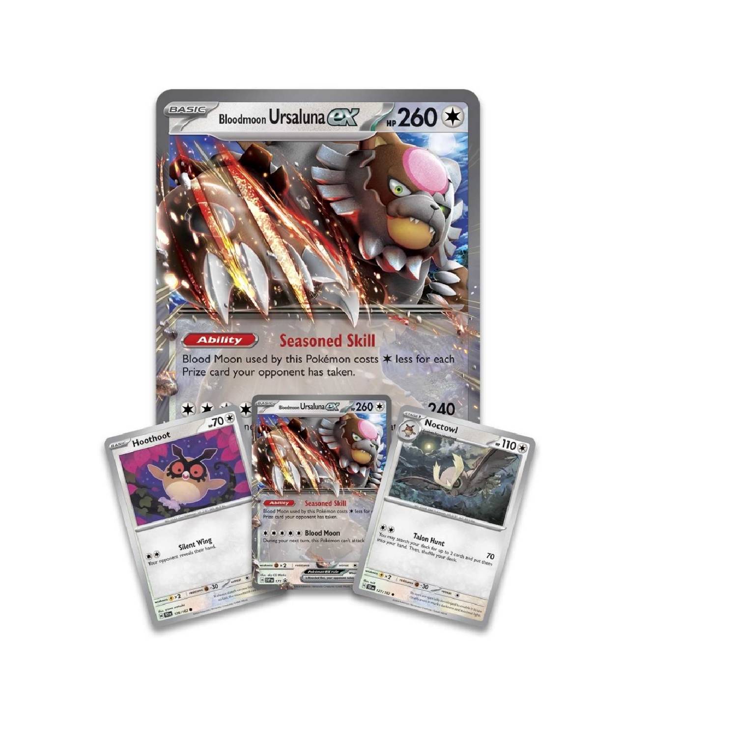 Su mirada atraviesa la oscuridad. La marca de luna llena en su frente brilla de un rojo intenso. Bloodmoon Ursaluna ronda por los huecos brumosos del bosque, atrayendo a Entrenadores experimentados en busca de aventuras. Este legendario Pokémon aparece aquí como un ex Pokémon, acompañado por sus compañeros habitantes de la noche Hoothoot y Noctowl, ¡y listo para aplicar su habilidad veterana en tu próxima batalla!
