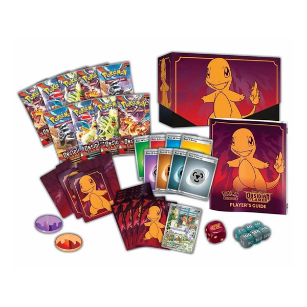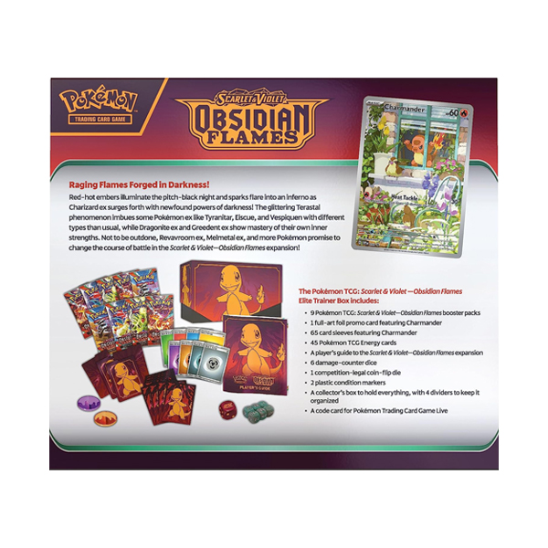 - ¿Qué incluye?: La Caja de Entrenador Élite de Escarlata y Púrpura-Llamas Obsidianas de JCC Pokémon contiene: