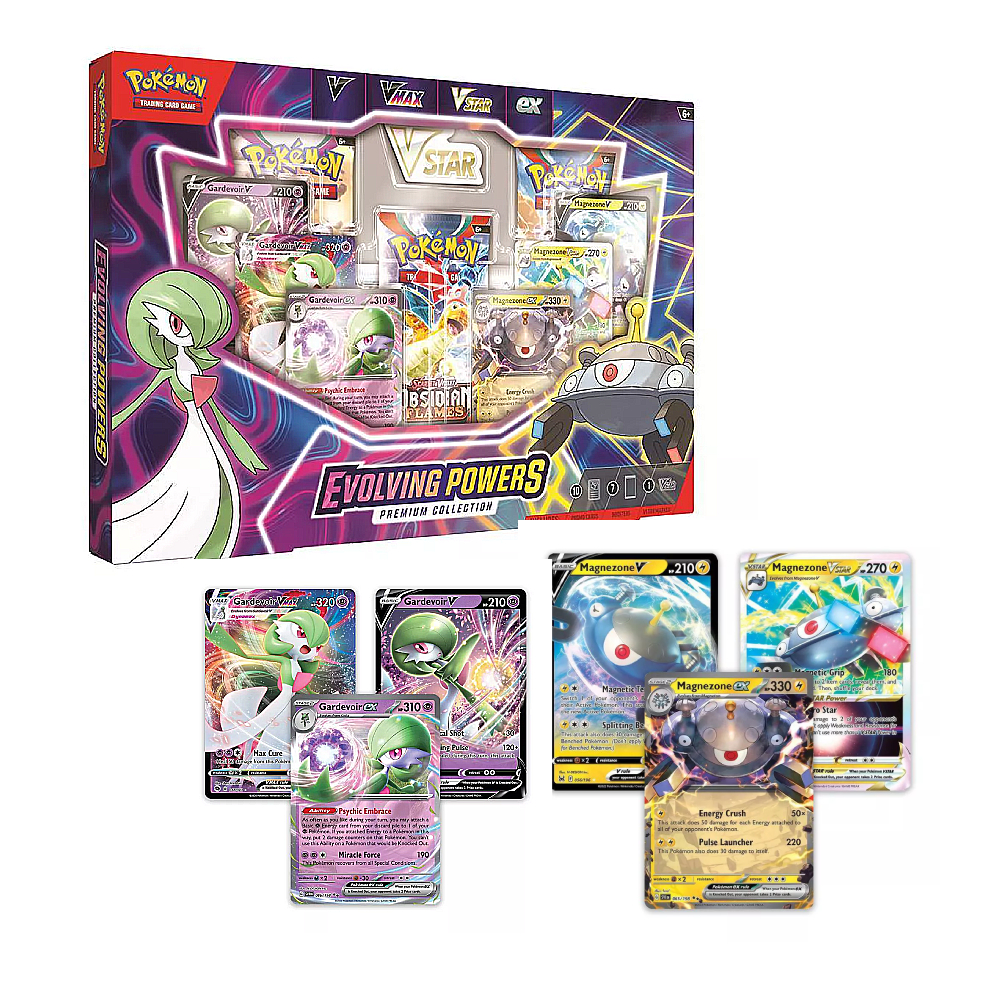 ¡Supera tus límites con Magnemite y Ralts en la Colección Premium de Poderes Evolutivos de JCC Pokémon! En esta poderosa caja llena de sorpresas, estos dos Pokémon están listos para luchar a tu lado. Supera a la oposición y podrás evolucionarlos hasta Magnezone y Gardevoir, ¡como Pokémon ex! Si eso no es suficiente poder evolutivo, Magnezone V y Gardevoir V también se unen a la contienda, con el potencial de evolucionar a Magnezone VSTAR y Gardevoir VMAX. Justo cuando pensabas que había terminado, ¡también obtienes 7 paquetes de mejora de JCC Pokémon para completar esta fiesta tan excepcional!