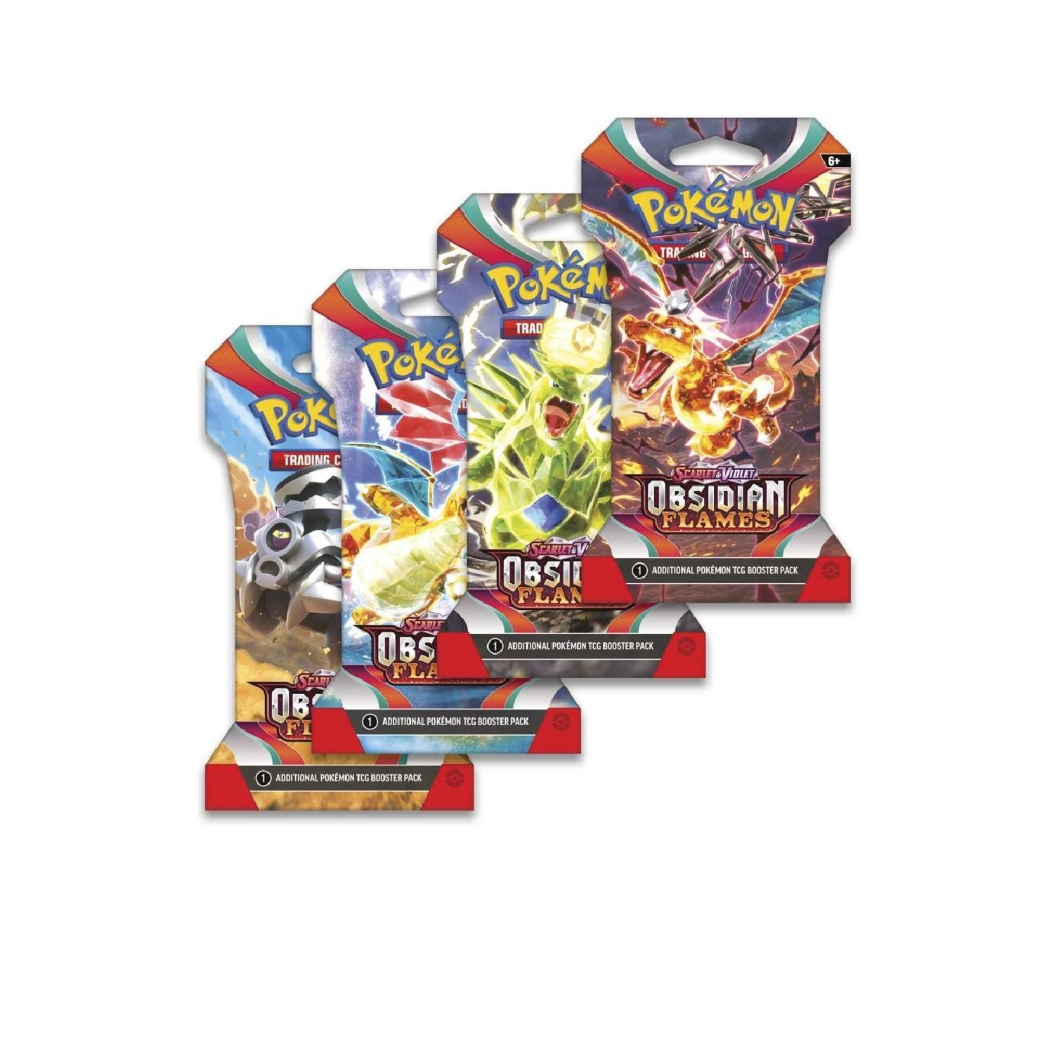Brasas al rojo vivo iluminan la noche oscura y las chispas se encienden en un infierno mientras Charizard ex emerge con nuevos poderes de la oscuridad. El brillante fenómeno Terastal dota a algunos Pokémon ex como Tyranitar, Eiscue y Vespiquen de tipos diferentes a los habituales, mientras que Dragonite ex y Greedent ex demuestran el dominio de sus propias fuerzas internas. Para no quedarse atrás, Revavroom ex, Melmetal ex y más Pokémon prometen cambiar el curso de la batalla en la expansión Scarlet & Violet—Obsidian Flames .