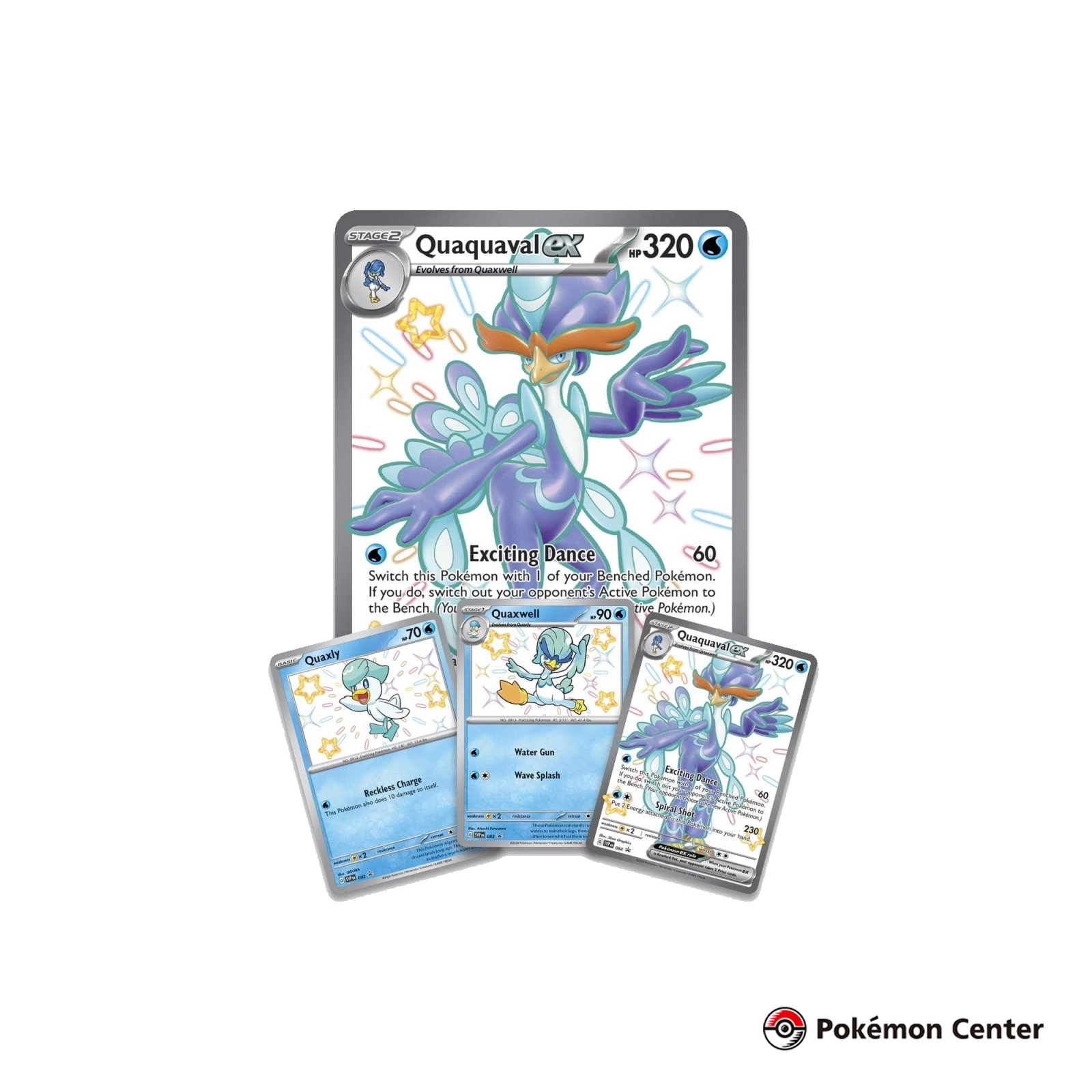 - 3 cartas promocionales con grabado en foil que presentan a Shiny Quaquaval ex, Shiny Quaxwell y Shiny Quaxly