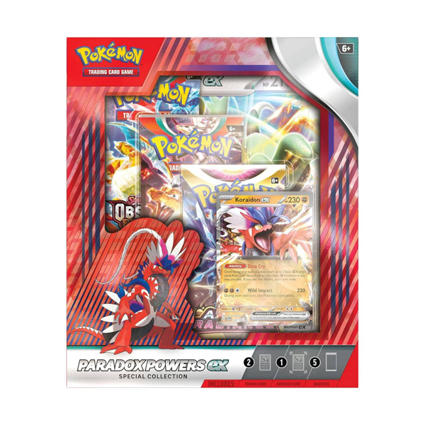 - La colección especial de cartas coleccionables Pokémon: Paradox Powers ex incluye 1 carta doble de aluminio rara con Koraidon ex y 1 carta doble de aluminio rara con Miraidon ex