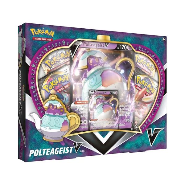 A veces, un Pokémon es un poco más refinado y fantasmagórico de lo que esperas, como Polteageist V, ¡con forma de tetera y lleno de un brebaje realmente fuerte! En esta caja, encontrarás ese sofisticado Pokémon Té Negro en dos tamaños, junto con tesoros de un puñado de paquetes de mejora de JCC Pokémon.