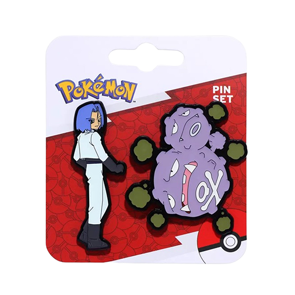 Exclusiva de BoxLunch ¡Atrapa este conjunto de pines Pokémon! Uno presenta a James con su atuendo del Equipo Rocket mirando por encima de su hombro, mientras que el otro muestra a su siempre leal Weezing flotando en el aire. Con colores llamativos y la animación característica de la serie, estos pines son perfectos para tu mochila, cordón o tablero de corcho.