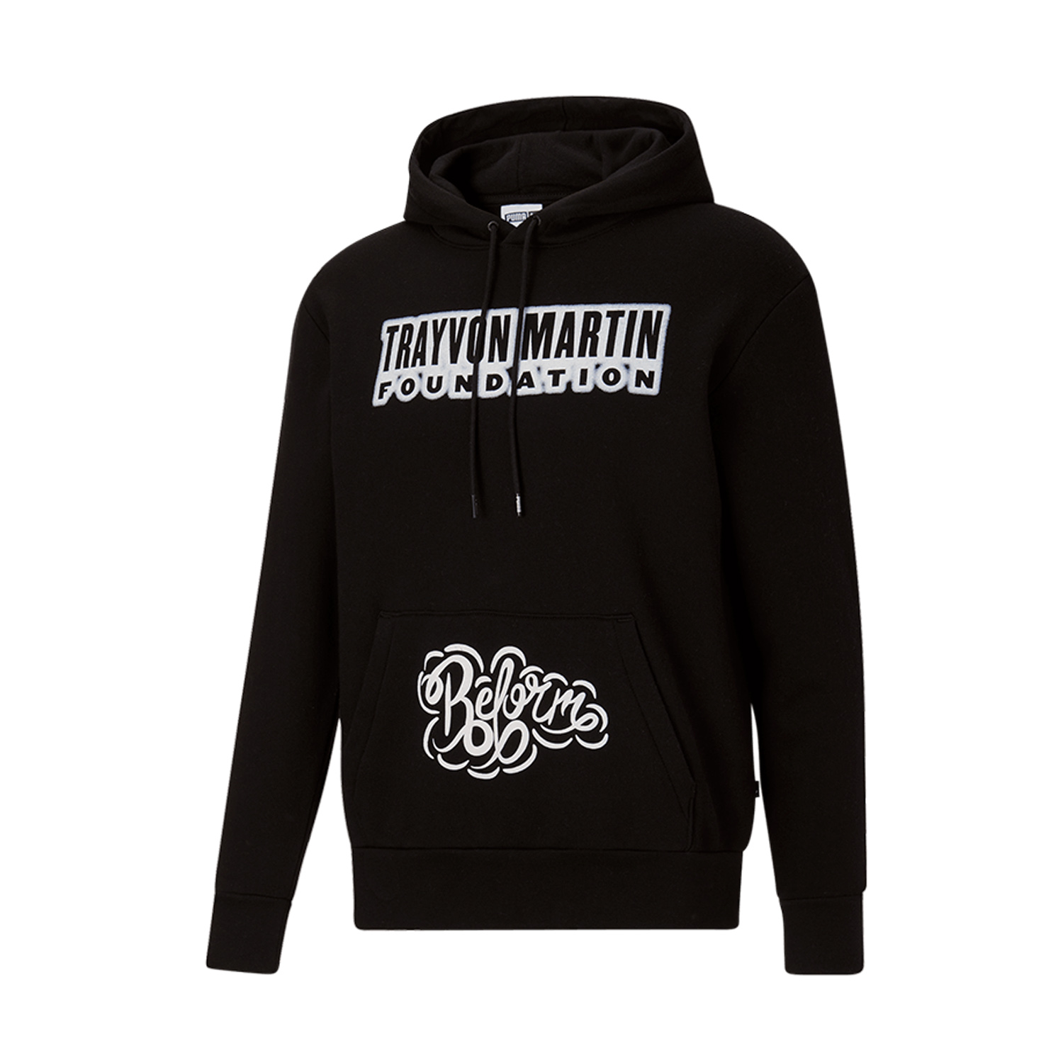 Esta polera con capucha negra de Puma destaca por su diseño en apoyo a la Fundación Trayvon Martin. En la parte superior del pecho, se lee «TRAYVON MARTIN FOUNDATION» en letras blancas mayúsculas, transmitiendo un mensaje de justicia social. El bolsillo frontal tipo canguro presenta un diseño artístico con la palabra «Reform» en un estilo cursivo decorativo. Los cordones en la capucha añaden un toque práctico a esta prenda de alta calidad, ideal para quienes buscan combinar estilo y compromiso social.